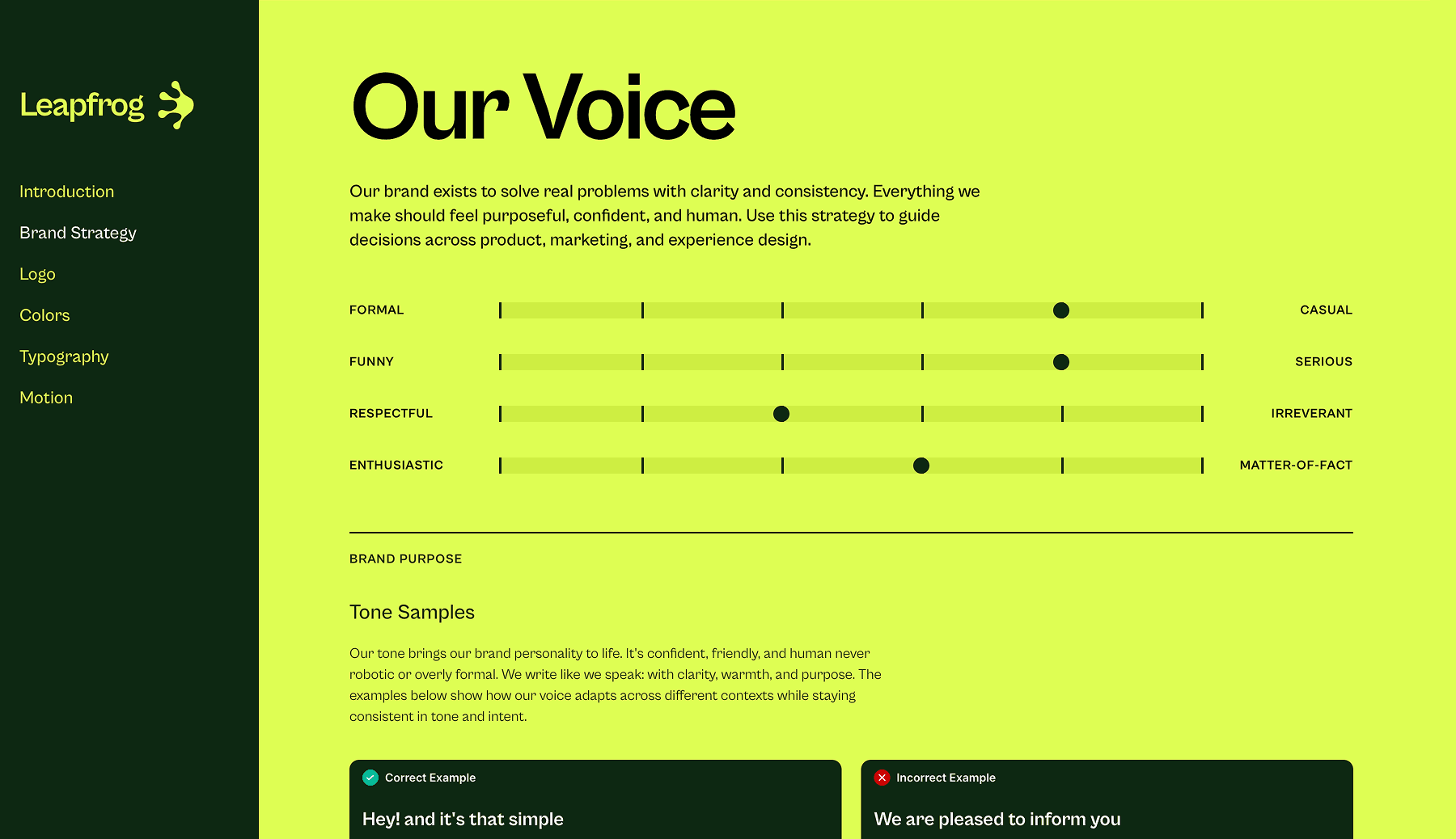 Show, don't just tell. Motion examples and dynamic components demonstrate how your brand moves and behaves across platforms.