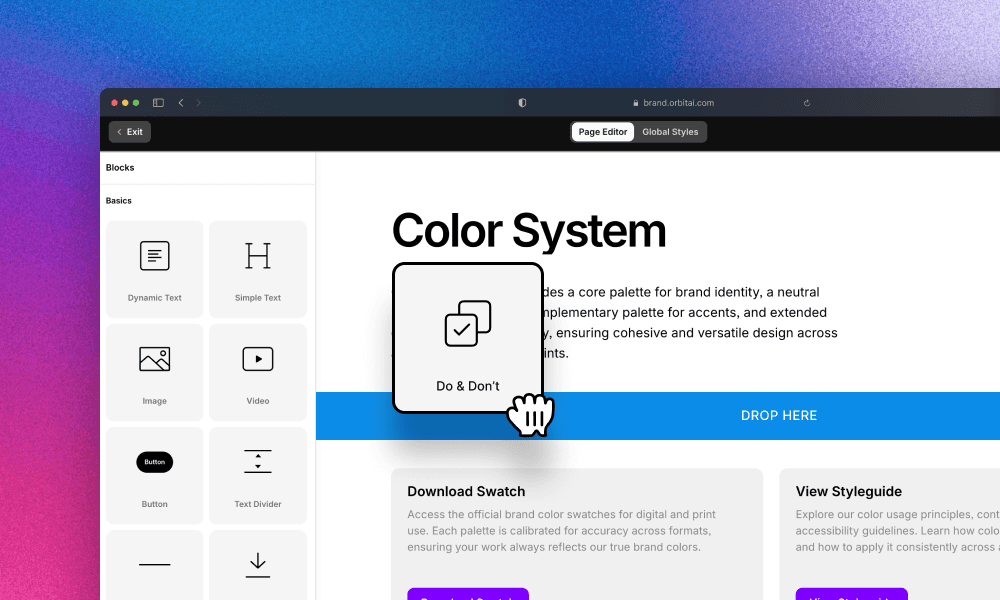Drag-and-drop blocks, clean interface, zero learning curve. If you've used any modern page builder, you'll feel right at home. Build guidelines in minutes, not hours.