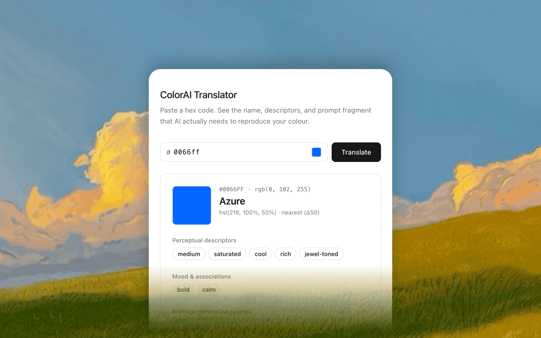The ColorAI Translator takes a hex code like #0066FF and automatically generates: