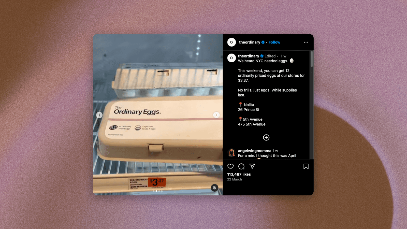 Affordability is a core value. Whether it’s skincare or staple goods, The Ordinary has always positioned itself as a champion of cost-conscious consumers. Selling eggs at a below-market price? On-brand.