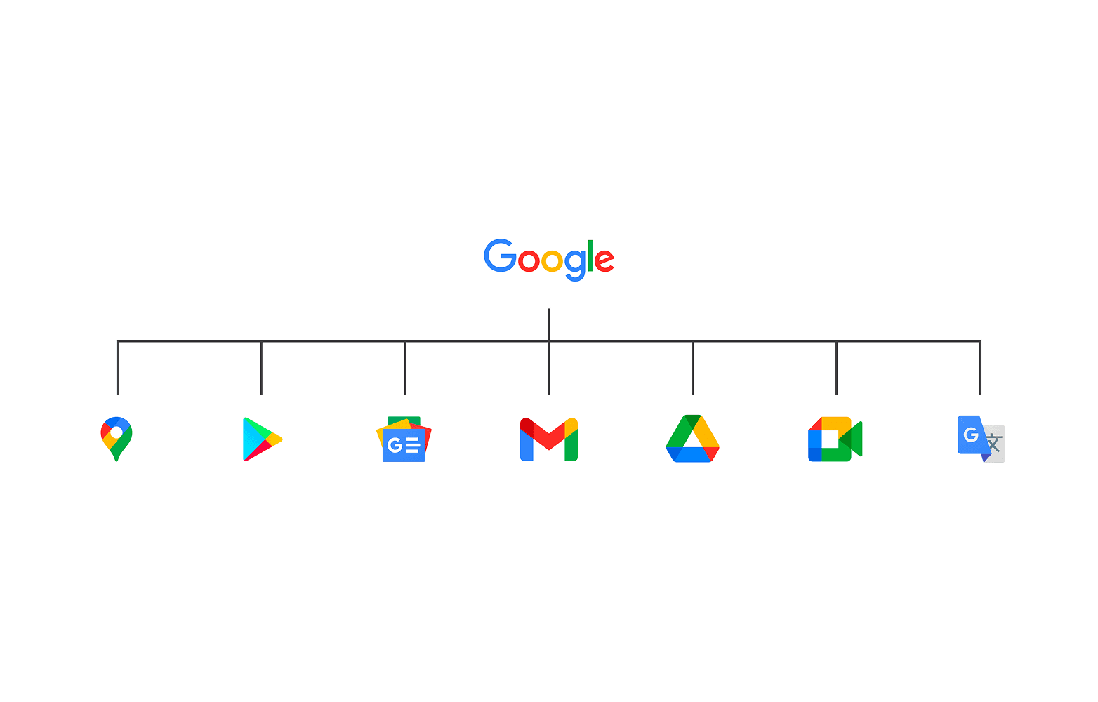 A single master brand spans across all products and services. Everything—from names to visual language—lives under one unified brand identity.