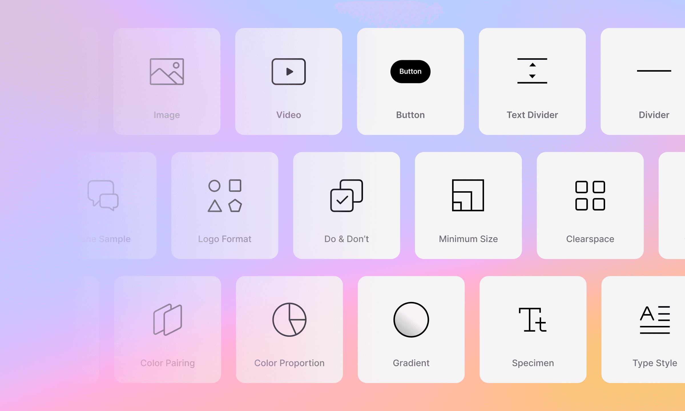 Blocks that document and demonstrate how your brand looks and behaves. Use these to build a complete visual system from logos and color to type, motion, and usage rules.
